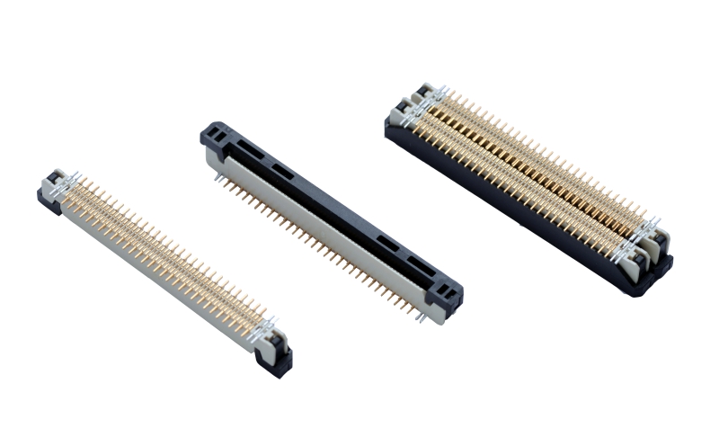 ◆ 該系列產(chǎn)品高度5.5mm,厚度3.2mm 間距為0.5mm的緊湊設計,采用ZIF方式,帶鎖條立貼。端子引腳采用Z 字形排列,
